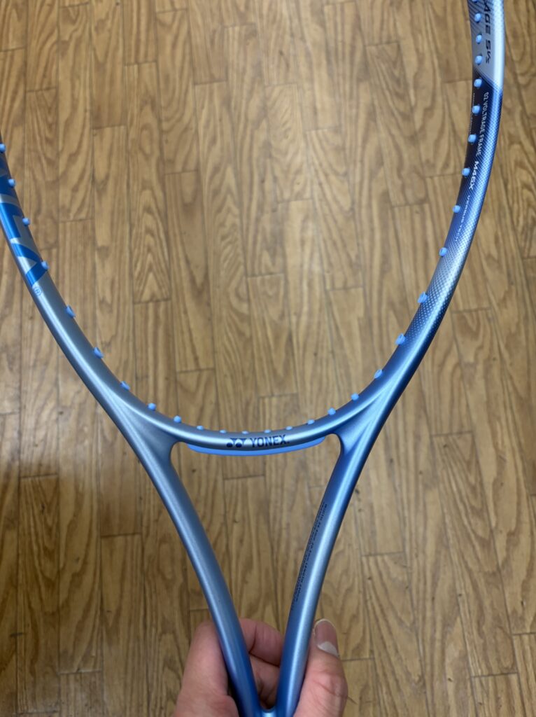 今回、弾き系ラケットでは久しぶりに、ストリングパターンが16×16になり、どの部分で1本減らしたのかな?ということを見ていたのですが、写真の通り、フレームの下半分がかなり目が粗く設定されており、ここで1本分を減らしているのであろう、と。