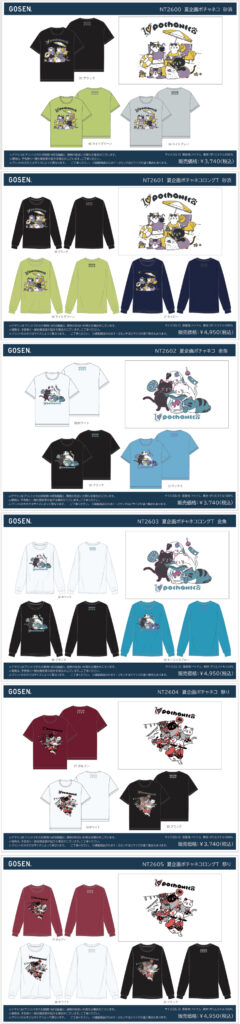この度は、Tシャツ、ロングTシャツ、ポチャネコウェア、キャップとなります。