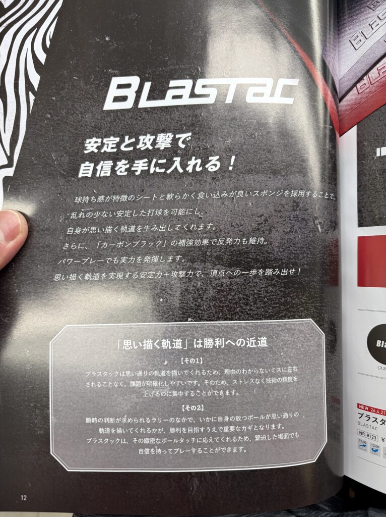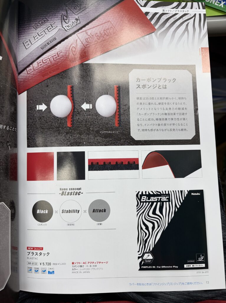 日本製、35°設計(ドイツ硬度基準ですと、45°だと思います。)の新製品テンションラバーのブラスタック。